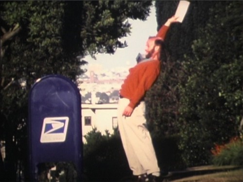 followers on the hook as “in a big way” fans. All works of the cycle lasted a full two minutes. One hundred and twenty seconds proved the perfect span for BUCKY, an erstwhile everyman who attempts to deal with the all-consuming Big City Madness by embracing and parodying it, to soar without hypnotizing his audience into a full-on “I’m ready for my straight-jacket, Mr. DeMille!” state. BUCKY faces the camera. The intrepid viewer realizes he or she has been signed up to document BUCKY’s least little move. Every gesture is pantomime, vaudeville, Kabuki — for Himself!! San Francisco streets are treats when you realize YOU are the CENTER of the STORM!!! BART trains are endless delights, like fish in the sea or masseuses in the Tenderloin — so many to choose from!! BUCKY is the one to be, ’cause BUCKY always wins! Like the fog, like David Carradine in Kung Fu, BUCKY drifts with the tides, plays possum as needed, and always triumphs! Those seeking success by poring over tomes of advice and self-improvement would much better invest their time in BUCKYS… Besides, wouldn’t you be better off with a life choreographed to Chopin and Dimitri Tiomkin?