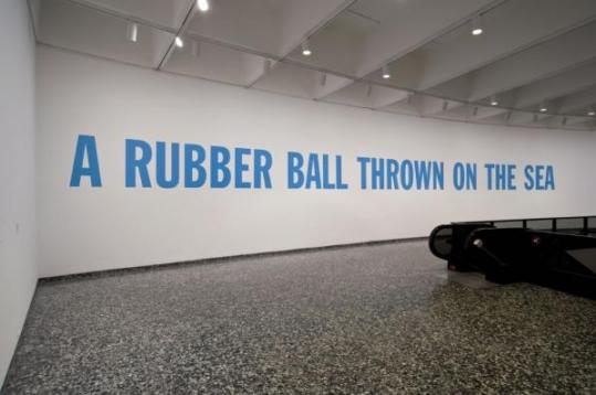 Lawrence Weiner’s work is complicated, glamorized by its rendering in language. “Art is the relationship of human beings to objects and objects to human beings,” while literature is “what human beings feel about other human beings,” the artist said in 1982. Words here do not mean something large and wonderful, or mean anything outside the objects they stand in for. Slate indicates nothing more than a slab of stone, water signifies the element itself.