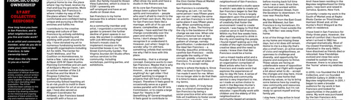 The 3.9 Art Collective is an association of African American artists, curators, and art writers who live in San Francisco, and who came together to draw attention to the city’s dwindling black population. The 3.9 Art Collective bears witness to this phenomenon and seeks to reverse it by drawing attention to the historical and ongoing presence of … Continue reading On San Francisco and Ownership: The 3.9 Art Collective Responds